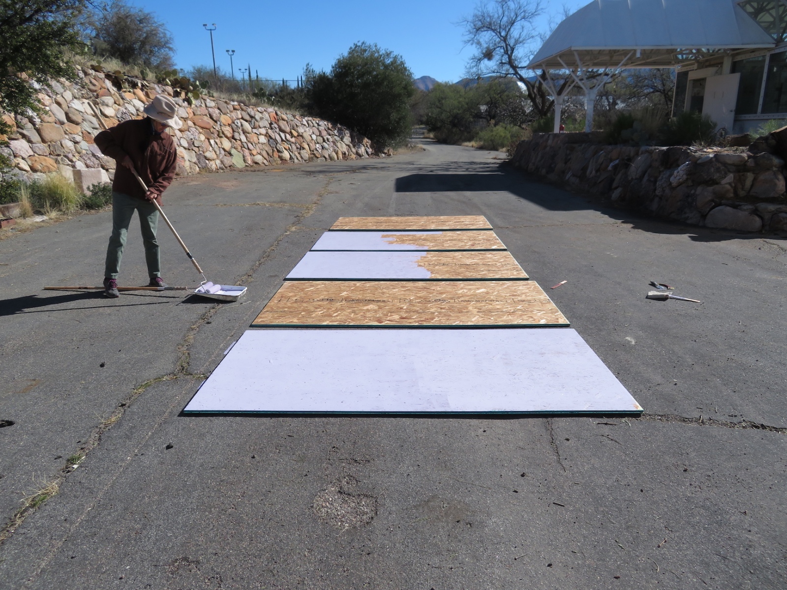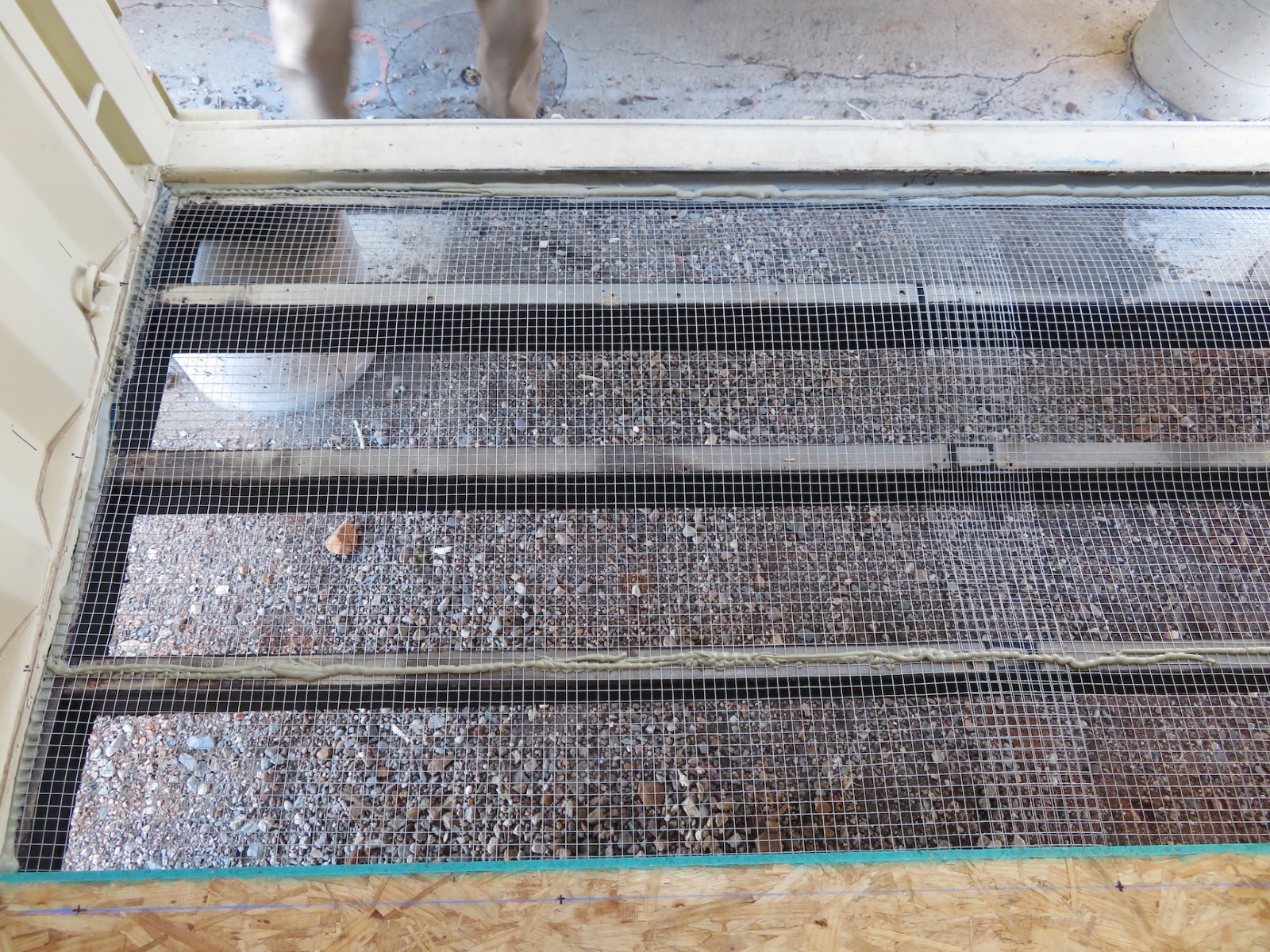 Our first (bottom) layer is a tight steel mesh to keep the rodents from chewing their way in (we hope that pack rats do not yet inhabit Mars). Then a layer of plywood to provide support for the insulating foam board, the foam board, and then another layer of plywood to protect the foam from the top and to provide a solid surface for the fifth and final layer—sheets of carbon steel.
