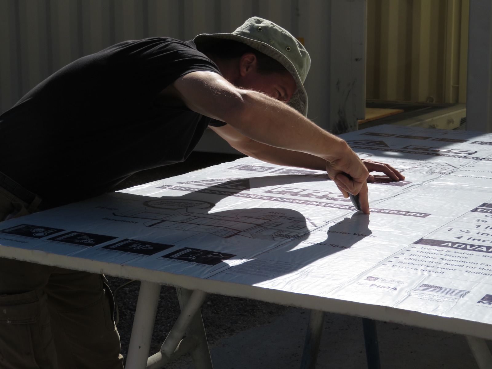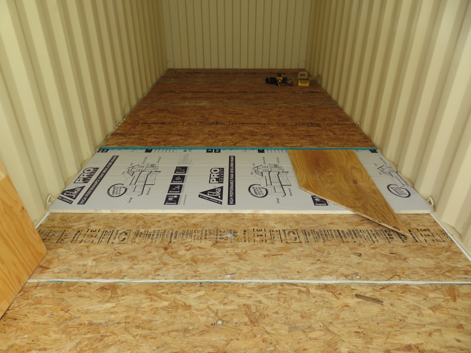 While the 40 foot shipping container came to us fully insulated (refrigerated) and essentially sealed (save a few openings at the front which will be easy to fill), we searched for more than three months to locate an insulated 20 foot container, to no avail. The 40 foot unit will be the living space for the crew while the 20 foot will serve as a corridor from the airlock to the crew quarters and Test Module. To facilitate a reduced thermal load and associated electrical consumption (with our intent to eventually go off-grid), we are manually insulating the 20 foot container, from the floor to walls to ceiling.