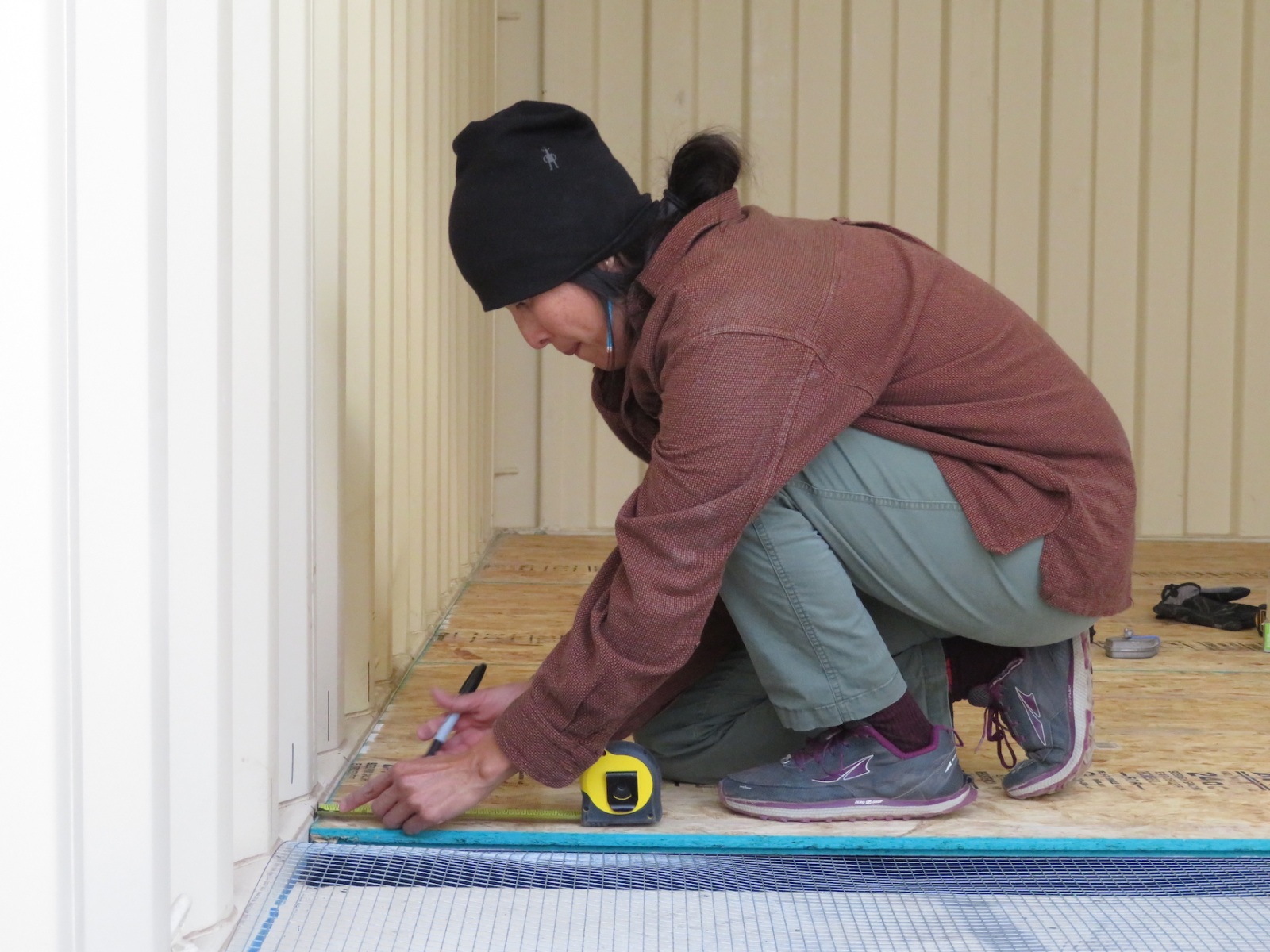 Starting from the ground up, we are designing a system by which the floor is insulated using standard building materials (plywood, foam board, adhesives) that will remain outside (below) the hermetic seal such that the inhabitants will not be breathing the space that contains the resins and glues associated with these products.