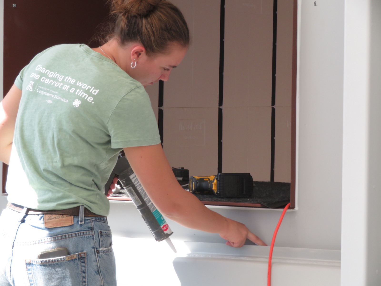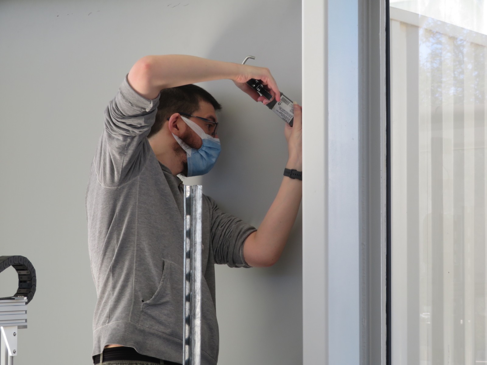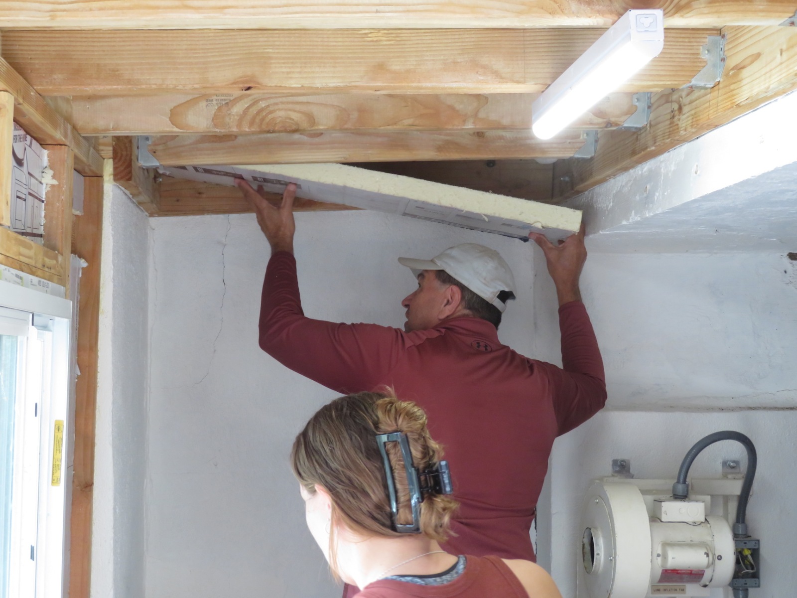 To this end, every sheet metal screw that extends from inside to out is backed out of its threads, coated with 795 silicon, and seated again. All temporary silicon finger beads will be replaced with silicon channels or welding to minimize the gas transmission over time. The final rows of insulation in the 20′ shipping container (SAM workshop) are being completed, a job unfinished from the final days of our effort in July.