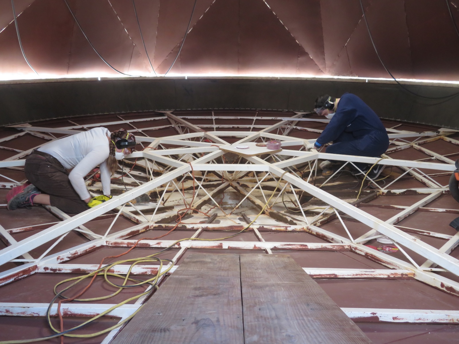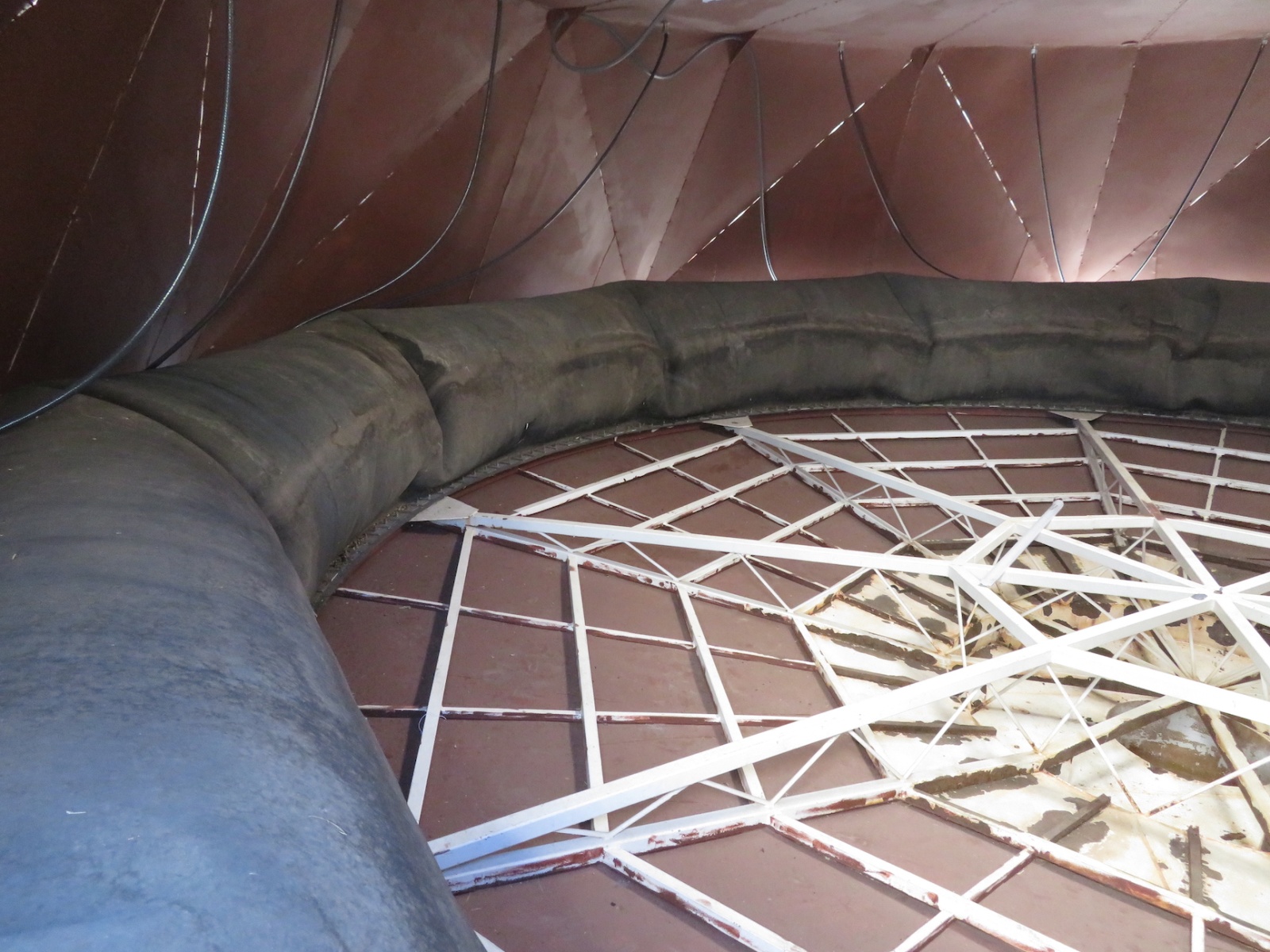 Before deflating the lung, Ezio notified Kai (via radio) of a previously unnoticed hissing sound. Kai entered the lung from the TM (through the tunnel) and discovered that roughly half of the patches applied to the holes in the original membrane were compromised—dried and cracked in just a little more than a year. This was completely unexpected, but perhaps a known function of siliconized rubber that was overlooked. Kai, John, and Luna have subsequently, carefully removed the old patches with new EPDM material (similar to the original membrane) on its way to Biosphere 2.