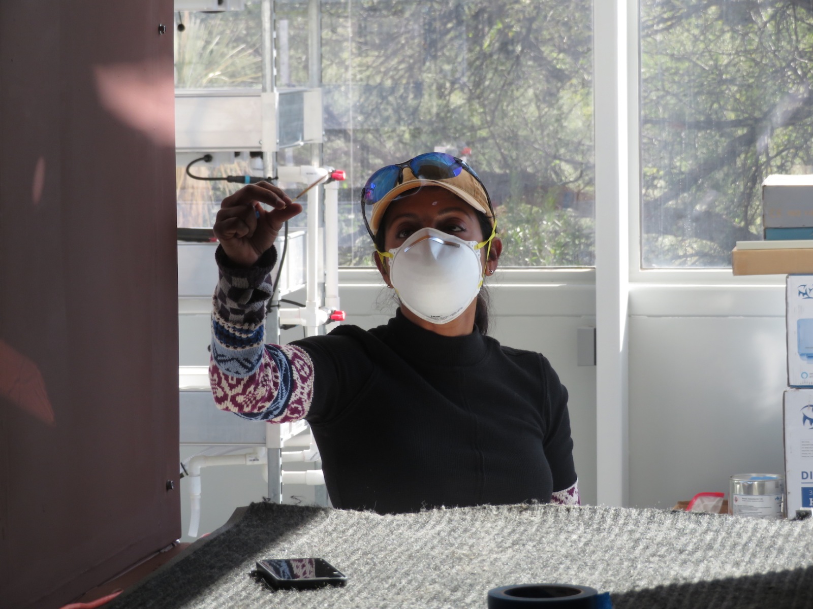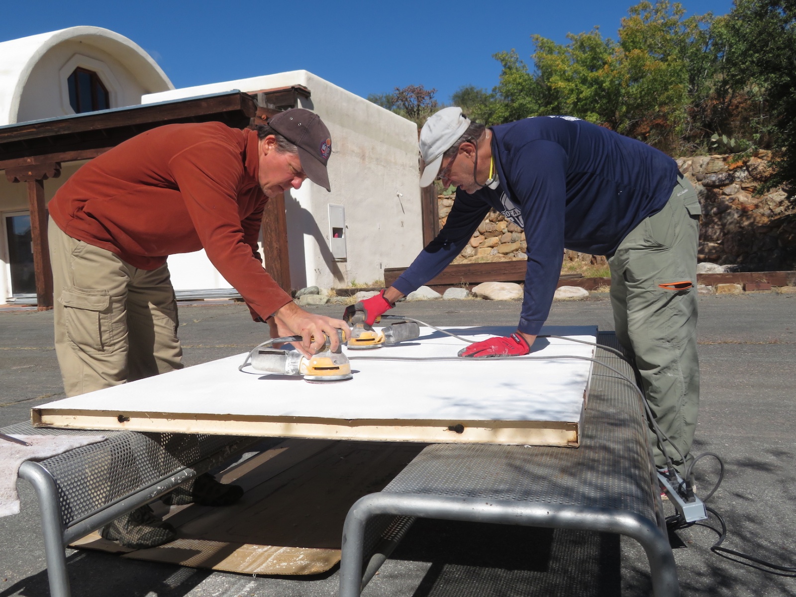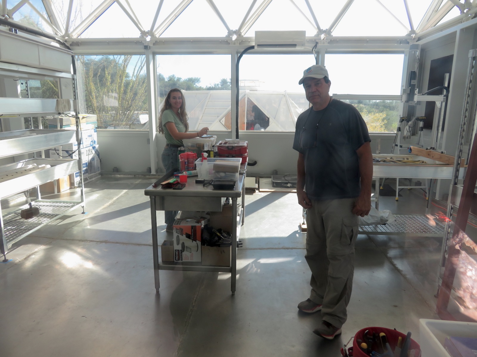 Kai grinding heads of sheet metal screws on SAM at Biosphere 2 Luna applies 795 silicon to screw heads in SAM at Biosphere 2
