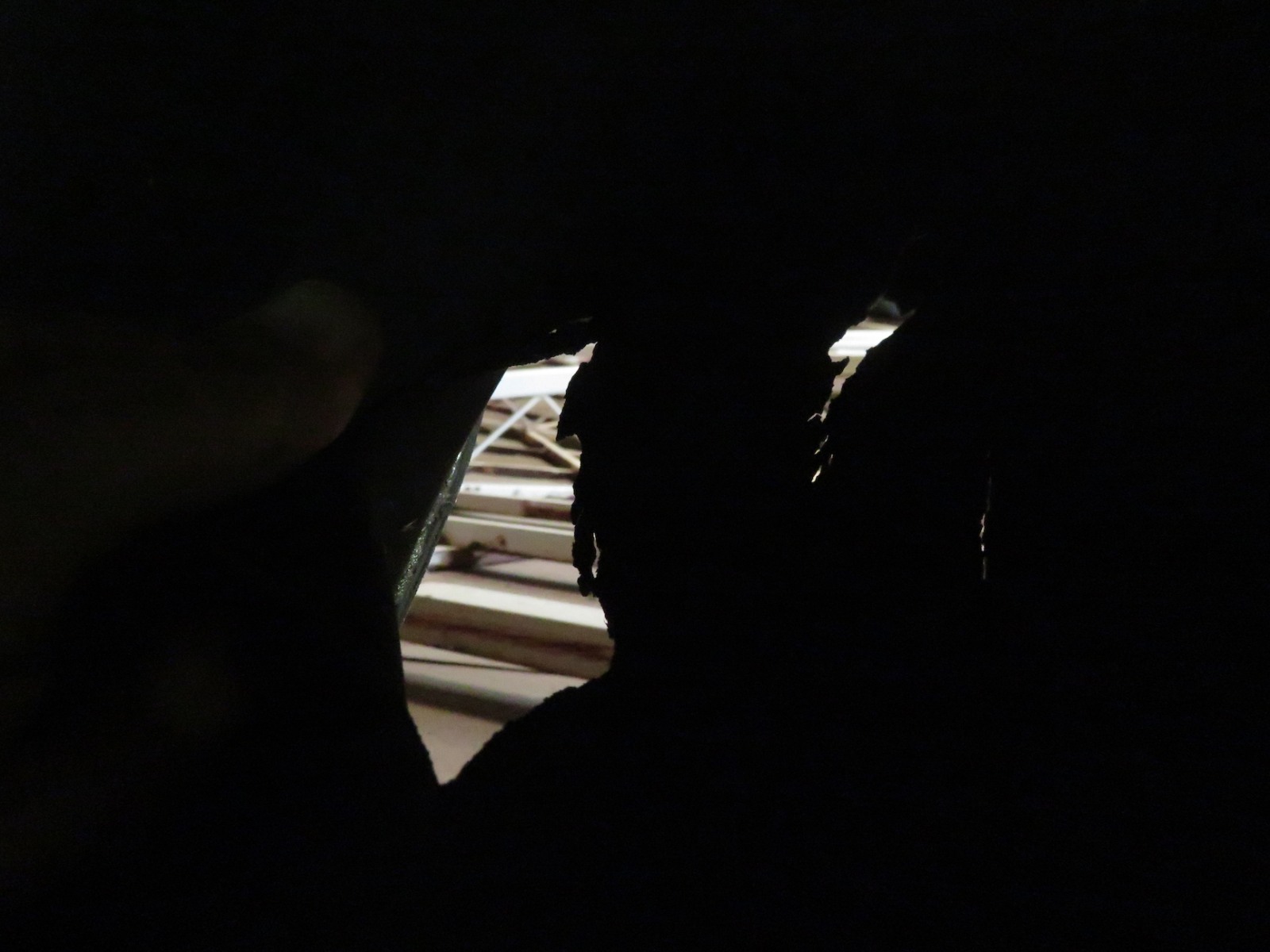 Kai applies incense smoke as a means to visually detect leaks in SAM, Biosphere 2 Once again, we engaged simple auditory inspection to detect the leaks, and the application of incense smoke to visually see leaks we could not hear or to confirm the exact location of those we could hear. Ezio returned as our super sleuth outside of the SAM pressure vessel and to operate the blower. He located an additional three leaks, two by listening and one by smell, which was unexpected by highly fortunate.