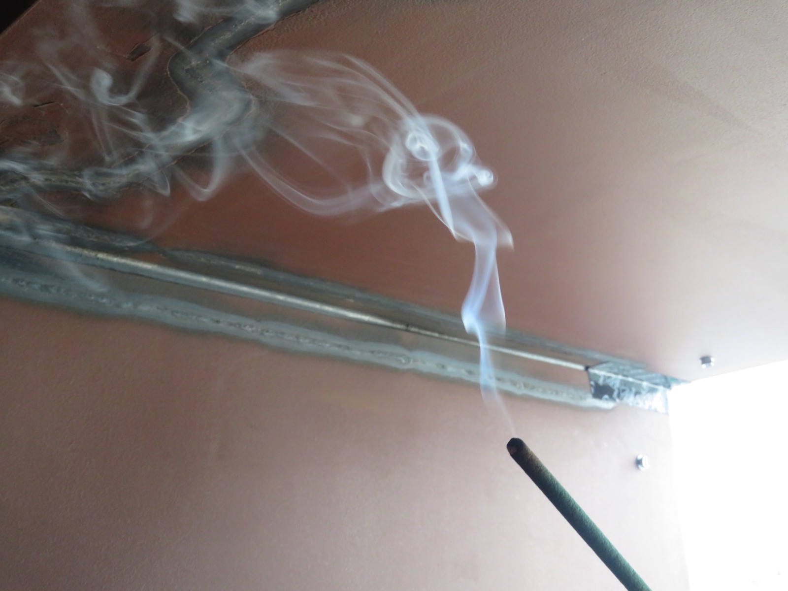 Using the technique described by William Dempster and Dr. Linda Leigh, we lit incense and moved slowly through SAM, module to module, interface to interface and sure enough! —we were able to visually confirm the leaks we could hear, and discover a few more too.