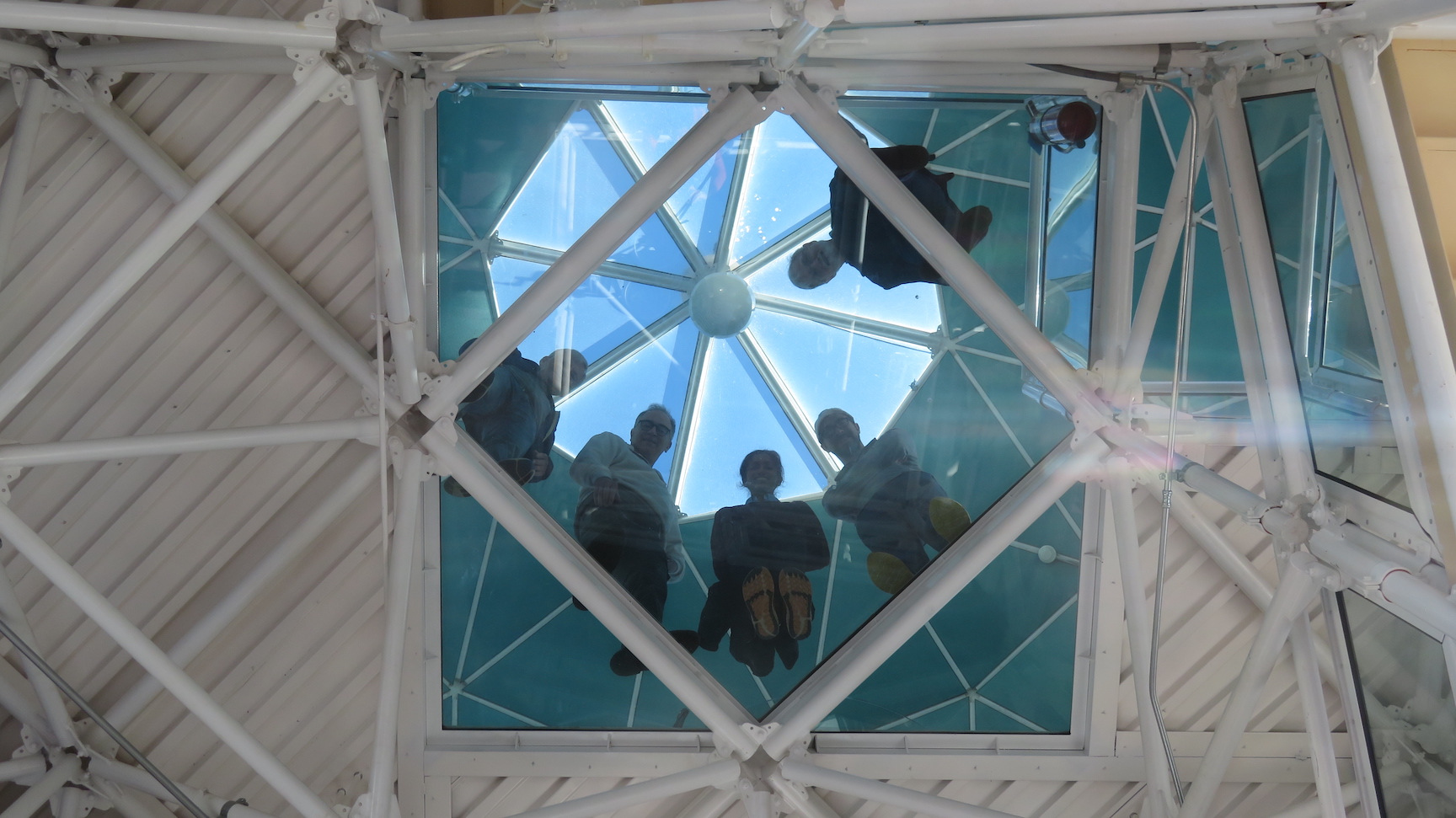 Master fabricator Nathan returned to SAM three weeks ago and as expected dove directly into a major effort to seal SAM. The number of leaks he has discovered in the 40′ is beyond what we expected, from tiny pin holes to major tears. In our last pressure test it was determined that the A/C unit continued to leak even after a massive amount of silicon was injected. So, we unmounted the head unit and rerouted the coolant and power lines through new hole in the side of the shipping container, allowing us direct access to the port such that we can test for and repair leaks more easily. The bathroom window has been completely removed and replaced with an all new polycarbonate construction. Nathan and Kai applied employed a version of the original Biospherian technique to seal the TM windows, resulting in what we believe will be a perfectly airtight seal. The TM/40 and 40/airlock bridges are fully rebuilt, and a dozen more leaks too. Fingers crossed for the next pressure test!
