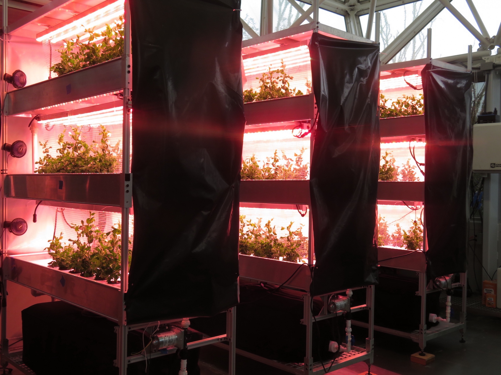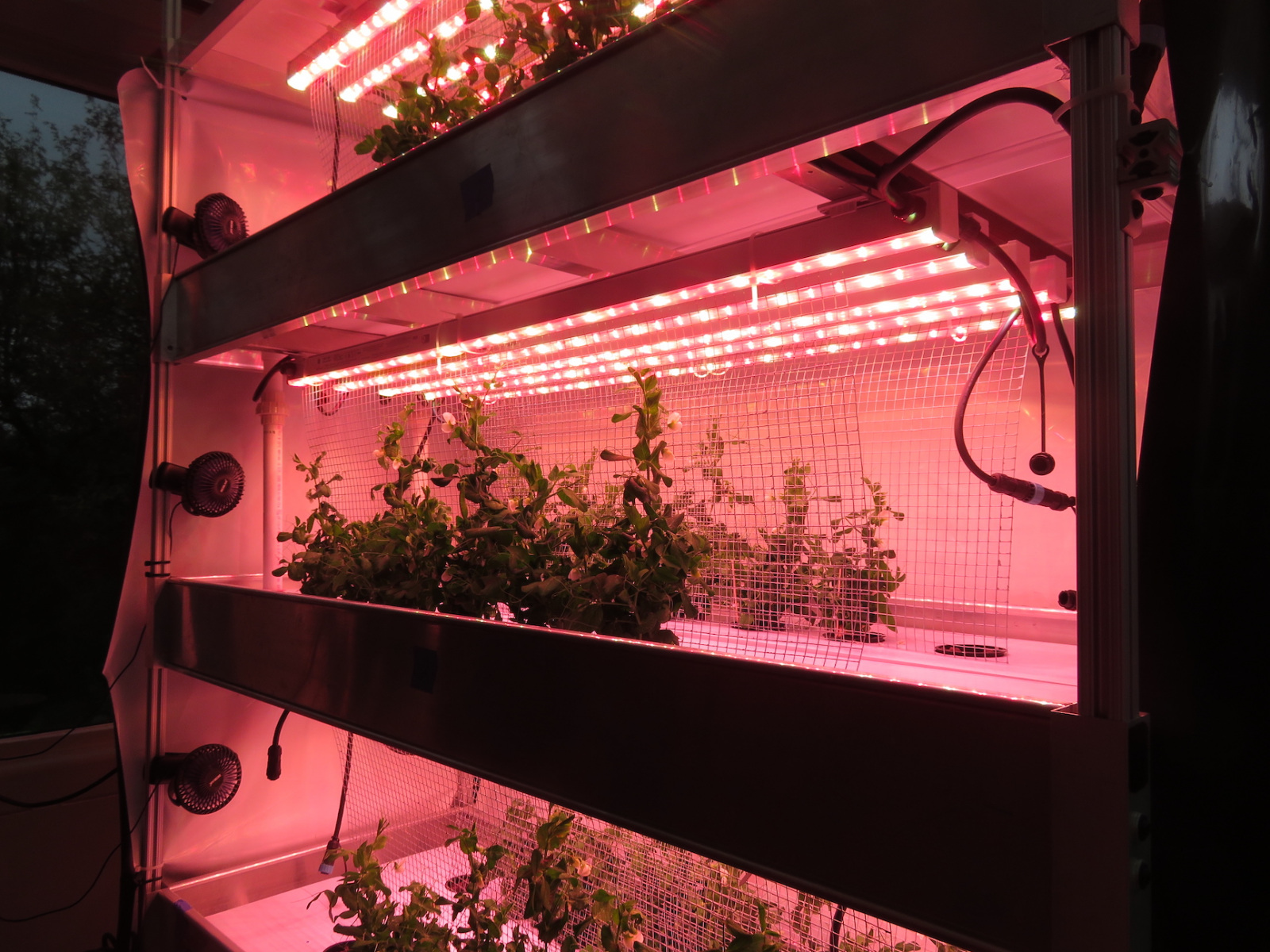 This experiment in bioregeneration at SAM is an integral component to the University of Arizona thesis for Masters candidate Atila Meszaros and UA undergraduate student Luna Powell, and concludes four of five controlled experiments (one more to go). The in-house design and constructed hydroponics system is an extension of the decades experience held by the University of Arizona’s Controlled Environment Agriculture Center (CEAC) with support by Dr. Gene Giacomelli, Dr. Triston Hooks, and Dr. Murat Kacira, and is being operated in collaboration with Dr. Lucie Poulet at the Bioastronautics & Life-Support Processes at University Clermont Auvergne, France. The dwarf pea employed was developed by Dr. Bruce Bugbee at Utah State University. And continued thanks to Dr. Ray Wheeler, NASA KSC for his work in controlled environment plants studies that lay the foundation for our food cultivar based bioregeneration.